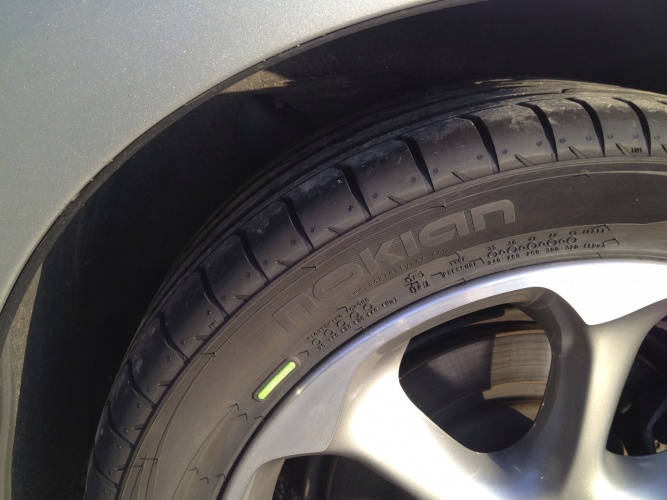 Så här långt verkar däcken hålla en bra kvalitet utan något onaturligt slitage. Däcken kommer med en tydligt präglad slitagemarkering med siffror som indikerar mönsterdjup. Allteftersom däcken slits försvinner siffrorna. I nuläget efter ca 1250 mil visar siffermarkeringen på framdäcken att mönsterdjupet är någonstans mellan 5 och 6 mm. Bakdäcken har inte gått under 7 mm. För att bättre förstå de siffrorna är det värt att nämna att bilen är relativt motorstark samt framhjulsdriven. Det är heller inte så att körstilen under testperioden varit speciellt inriktad på ekonomisk körning utan snarare på att noggrant utvärdera däckens egenskaper. :)